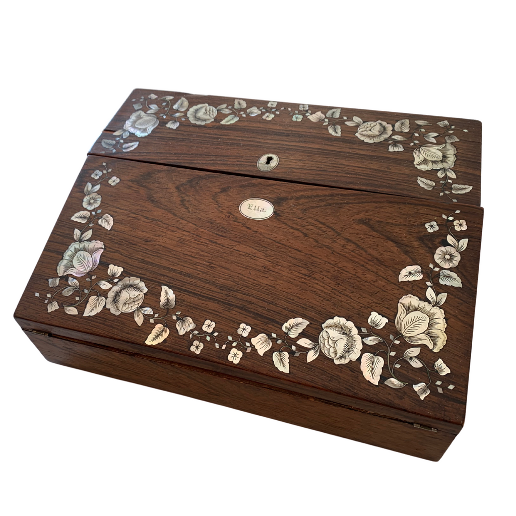 English Rosewood Writing Slope with Mother of Pearl Inlay Engraved with "Ella"