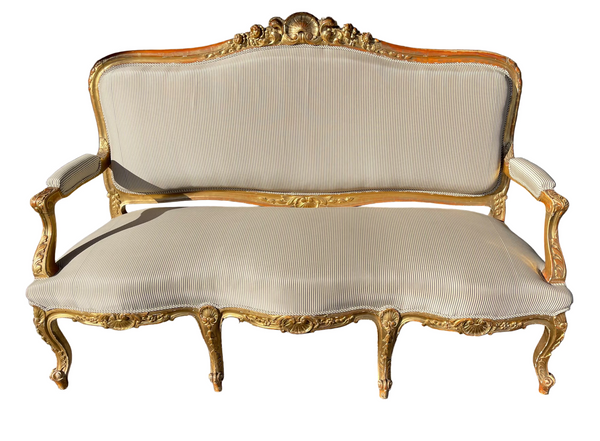 19th C. Louis XV Style Gilded Settee. The settee is a very fine and beautifully upholstered in an understated striped fabric, which adds to the versatility of this piece. The carved shell motifs and fabulous curves are just stunning. The gilding is original, and has a fabulous aged patina. And it's comfy!