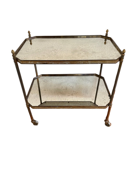 Fabulous Mid-Century neoclassical brass and vintage eglomised mirrored glass bar cart / drinks trolley. Features two rectangular, ocatgonal-edged tiers, elegant finials and casters.