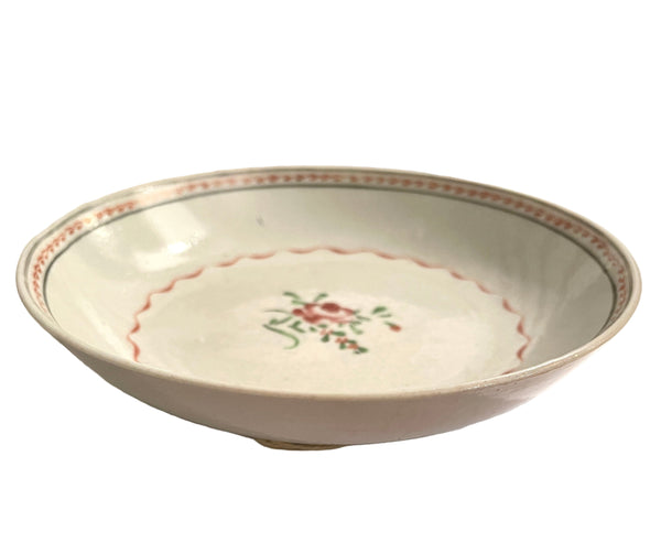 Unmarked, likely 18th c. Chinese Porcelain Famille Rose Painted Saucer. Pink and red famille rose palette in the center, with scalloped inner and outer borders. This would be precious in a girl's nursery or bedroom, in a powder room or bathroom, or on a dressing table. So very classic, mindful and demure.